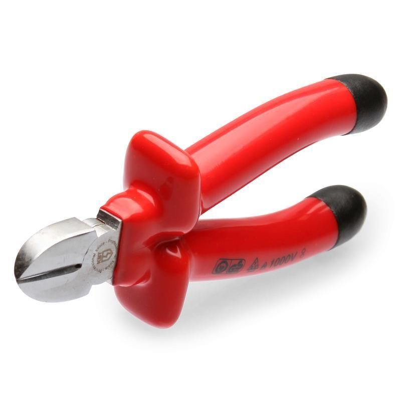 • Для работ под напряжением до 1000 В • Материал рукояток: двухслойная диэлектрическая пластизоль • Внутренний слой (сигнальный) – желтый (светло-красный), внешний слой – красный • Режущие кромки дополнительно закалены токами высокой частоты. HRC 58...62 • Двухсторонняя диагональная заточка лезвий • Резка мягкой проволоки до 4 мм и твердой проволоки до 2 мм • Резка провода O до 6 мм • Чистый и аккуратный рез • Материал рабочей части: хром-ванадиевая сталь • Обработка поверхности: матовое никелирование • Вес инструмента: 284 г • Длина инструмента: 160 мм