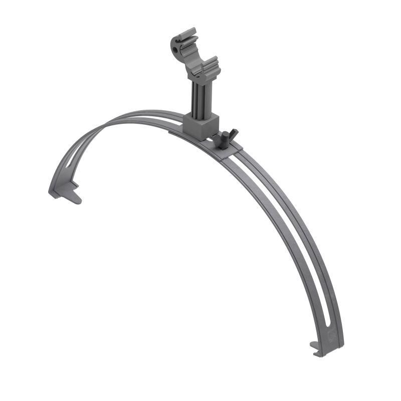 Регулируемый коньковый зажим с пластиковым держателем применяется для крепления молниеприемной сетки на основе прутка диаметром 8 мм или на основе полосы шириной 25 мм на круглом коньке кровли. Проводник фиксируется путем защелкивания. Диапазон зажима - 220-380 мм. Материал - горячеоцинкованная сталь.