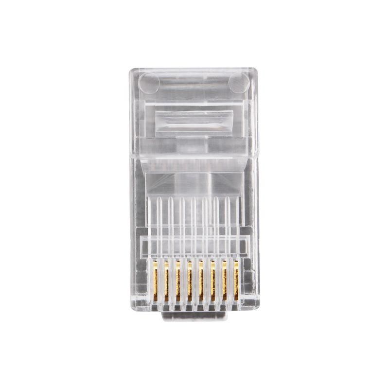 Разъем RJ-45 (8P8C) REXANT под витую пару, U/UTP, CAT 5e. Предназначен для соединения телекоммуникационного оборудования: компьютеров, офисных АТС, сетевых коммутаторов, концентраторов, коммутационных панелей, маршрутизаторов, патч-панелей, сетевых карт, а также другого оборудования, имеющего гнездо 8P8C. Штекер изготовлен из прозрачного качественного пластика, имеет 8 посадочных мест и 8 ножей-контактов, которые покрыты слоем технического золота 3 мкм для повышения пропускной способности разъема. Фиксация разъема на кабеле производится специальным обжимным инструментом. При изготовлении продукции использованы надежные материалы, обеспечивающие высокий уровень передачи данных, долгий срок службы, а также гарантию работоспособности товара. Технические характеристики: Исполнение: registered jack Тип разъема: RJ45 8(8) Категория: 5Е Способ присоединения: обжимной Подходит для многопроволочных проводников: да Экран: нет Слой технического золота: 3 мкм Количество контактов: 8