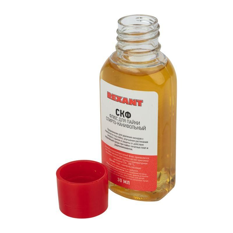 Флюс СКФ (спирто-канифольный) REXANT предназначен для удаления оксидов с поверхности под пайку, улучшения растекания жидкого припоя и защиты от действия окружающей среды при пайке печатных плат и радиокомпонентов. Наиболее эффективен при работе с медью и ее сплавами. Изготовлен в соответствии с ОСТ 4Г 0.033.200. Часто используется для ремонта радиоаппаратуры. Температура наибольшей активности: +150...+300°С. Данный флюс является нейтральным, то есть не вызывает разрушение металла, поэтому по окончании пайки смывка не требуется. В процессе хранения при низких температурах допускается образование осадка, не влияющего на качество флюса. Основные компоненты: связующая жидкость и канифоль. Вариант фасовки – флакон объемом 30 мл.