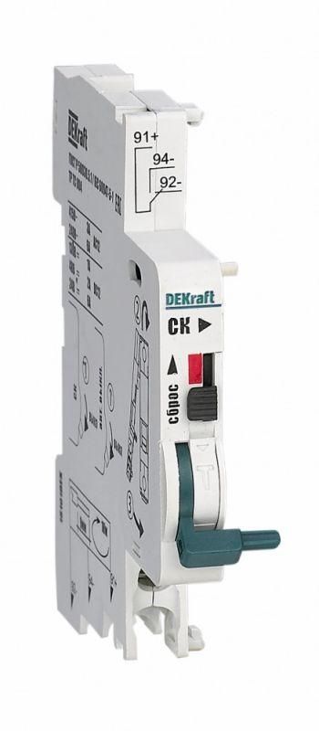 Контакт сигнальный СК-101 для автоматических выключателей серии ВА-101 Dekraft; предназначен для сигнализации аварийного срабатывания выключателя; тип контакта переключающий; ширина 9 мм; присоединение к выключателю слева.