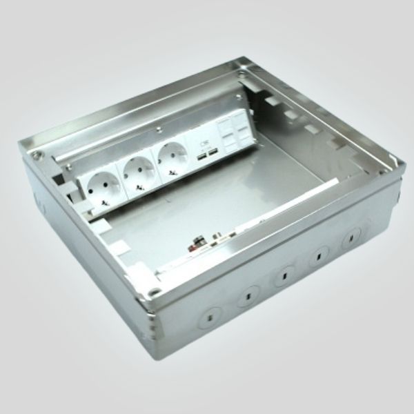 Стальной напольный люк под розетки с откидной и вынимаемой крышкой — прочное и эстетичное решение для офиса или дома. В комплекте 10 розеток 220 В. Крышка глубиной 15 мм позволяет уложить плитку или паркетную доску, оставляя видимым лишь тонкий периметр 3 мм. Люк выдерживает нагрузку до 600 кг, подходит для стяжки от 60 мм и имеет вводы Ø25 мм для кабелей. Регулировочные винты обеспечивают точное выравнивание (+30 мм). Допускается влажная уборка при закрытой крышке. Надёжно, аккуратно, удобно.