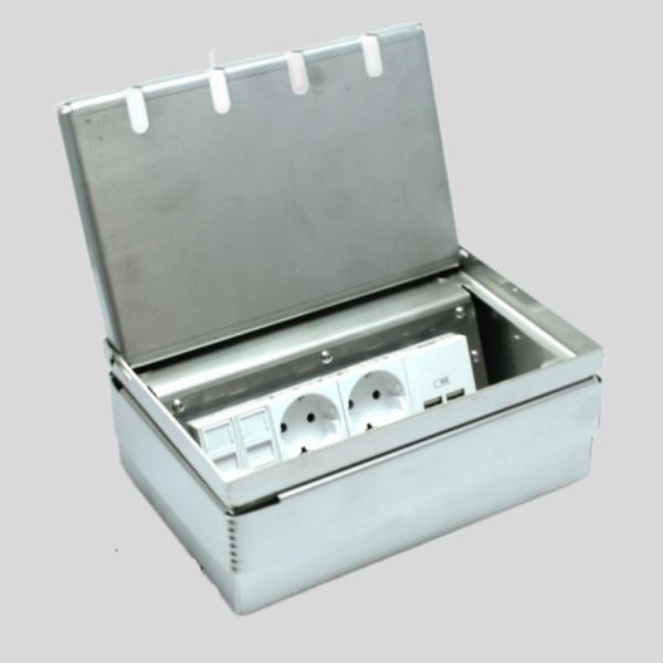 Стальной напольный люк под розетки с откидной и вынимаемой крышкой - прочное и эстетичное решение для офиса или дома. В комплекте 4 розетки 220 В. Крышка глубиной 15 мм позволяет уложить плитку или паркетную доску, оставляя видимым лишь тонкий периметр 3 мм. Люк выдерживает нагрузку до 600 кг, подходит для стяжки от 60 мм и имеет вводы Ø25 мм для кабелей. Регулировочные винты обеспечивают точное выравнивание (+30 мм). Допускается влажная уборка при закрытой крышке. Надёжно, аккуратно, удобно.
