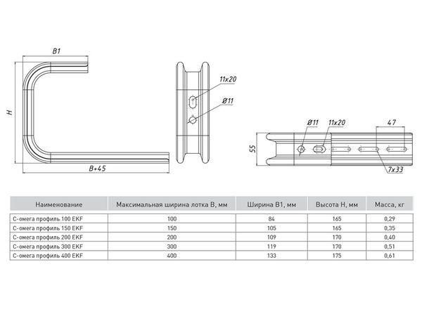 "Омега профили предназначены для легких нагрузок и могут быть смонтированы как к стене, так и к потолку. Они обеспечивают надежный и быстрый монтаж металлических кабельных лотков любой ширины. Имеют удобную перфорацию под анкерные болты или шпильки М10. Стандартная толщина профилей - 1,5 мм. Кабельные лотки EKF-Line крепятся к профилям стандартным комплектом метизов wgm6x16."